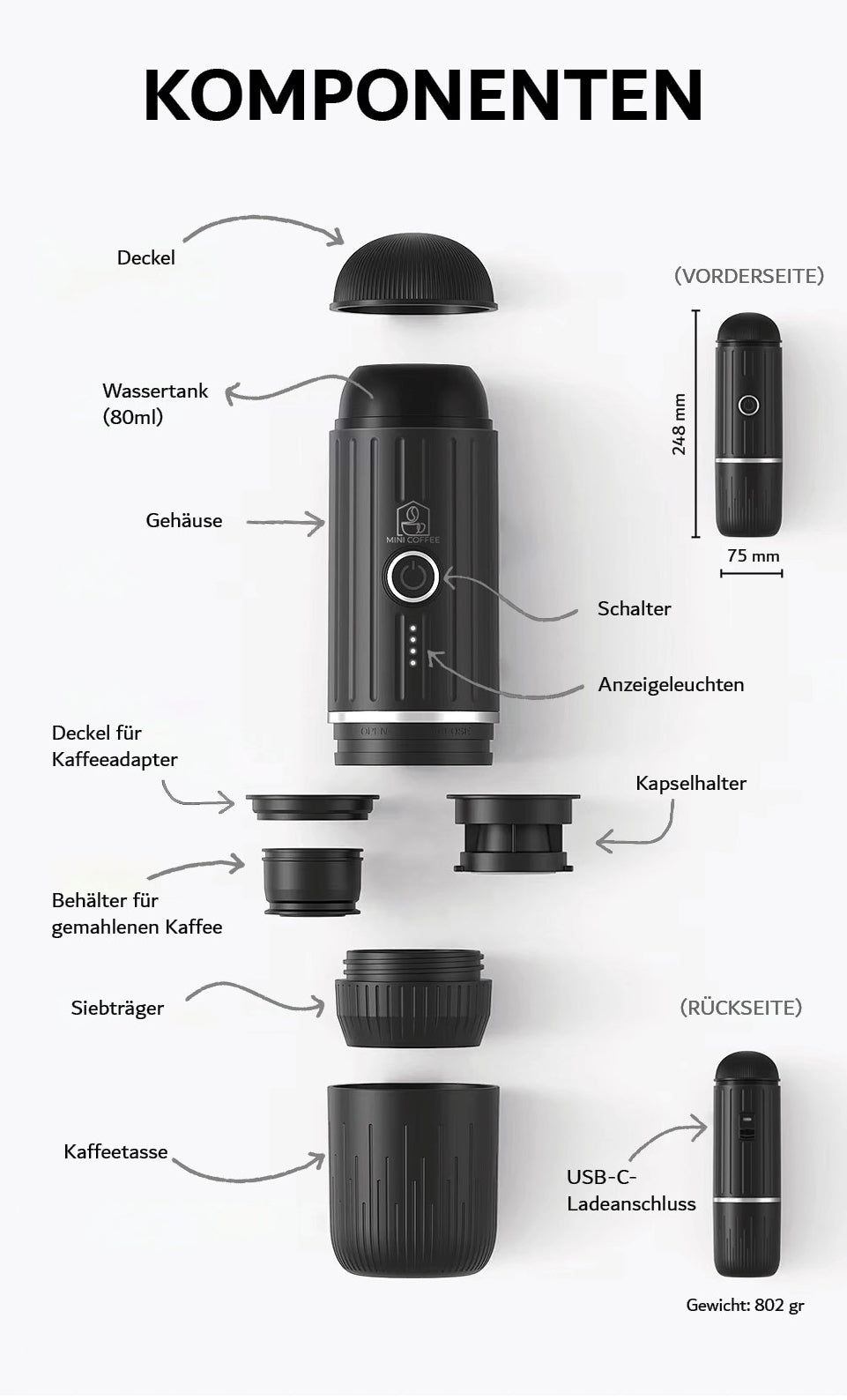 Espresso, wann und wo du willst! Wir haben die grosse Maschine auf die Grösse einer Wasserflasche reduziert, damit du deinen Kaffee überall geniessen kannst. Perfekt für Abenteurer – egal, ob beim Camping, Wandern oder einfach im Auto. Über USB-C laden, loslegen und geniessen!